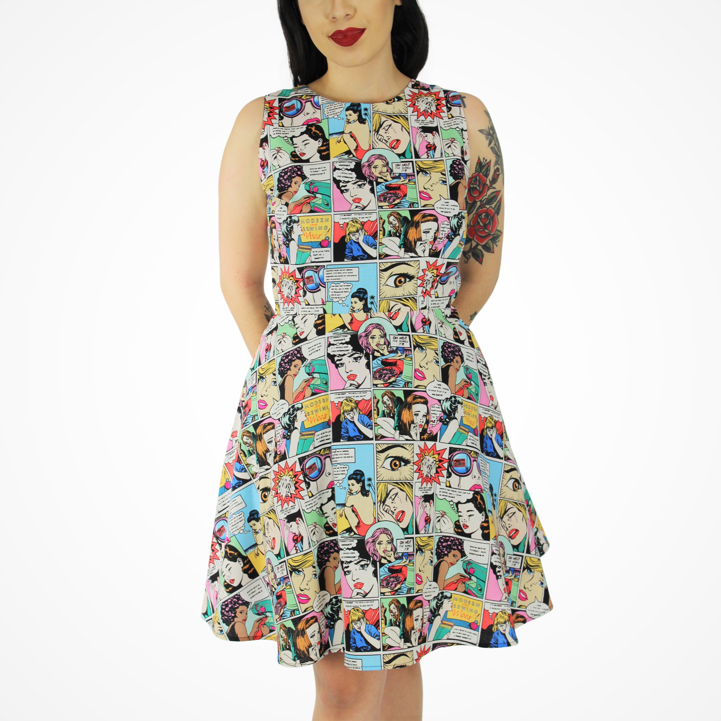 Amazing retro inspired comic strip skater dress! The dress has a fitted bodice, flares out at the waist, and features a retro inspired comic strip over a white background on the fabric. The assortment of images on the dress gives it the wonderful retro inspired silhouette and can be worn with a petticoat for a complete showstopping look.