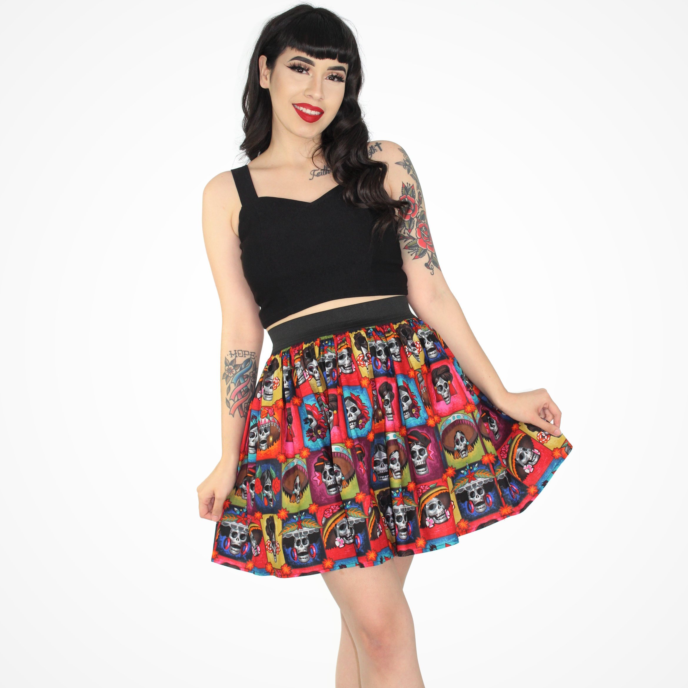 Beautiful Day of the Dead inspired elastic skirt is suitable for everyday, holidays, and parties! Pair the bottom with a simple black or vibrant red off the shoulder top. The fabric features a repeated pattern of dapper skeletons wearing hats or flowers in a colorful painterly like square.
