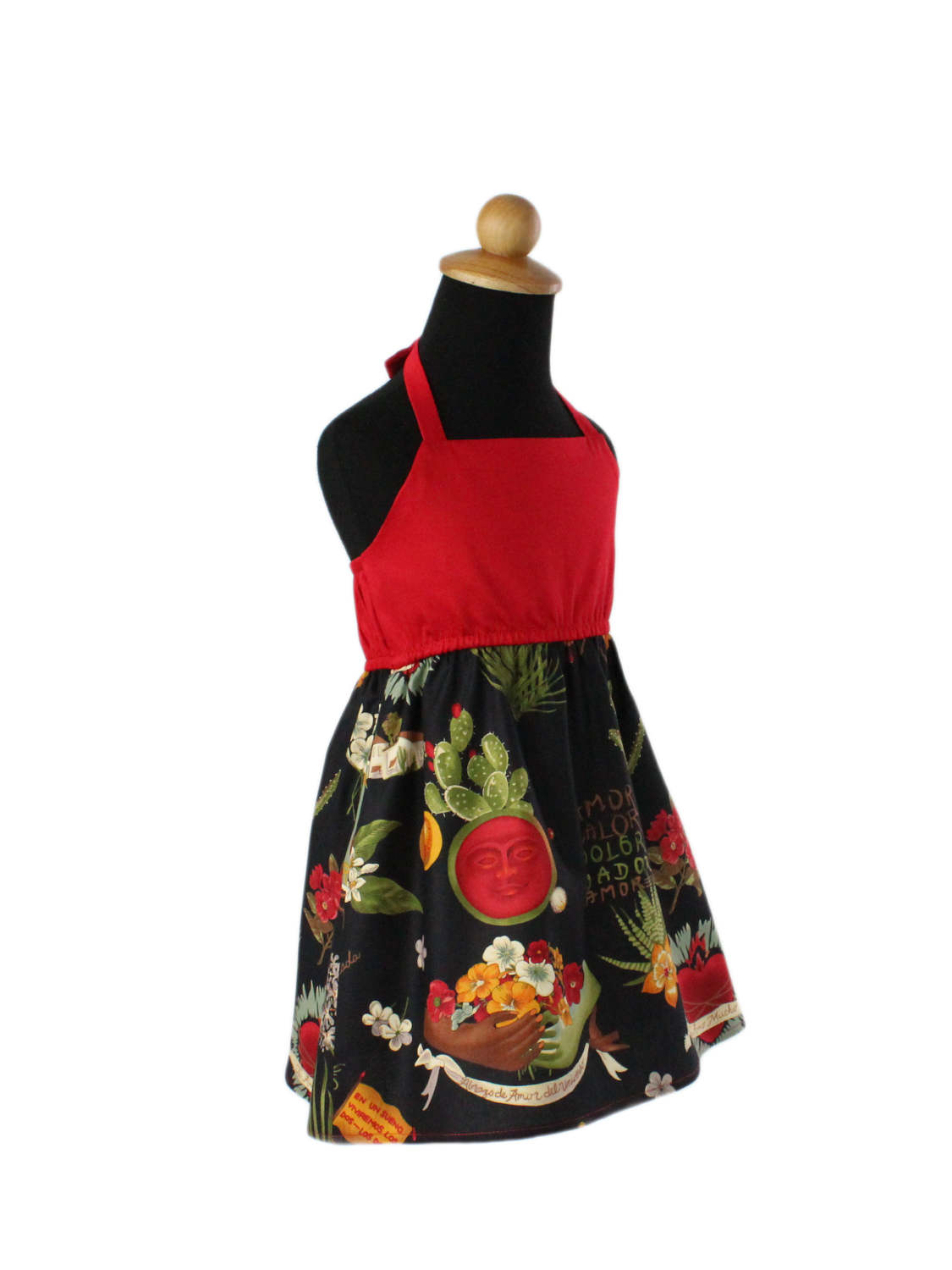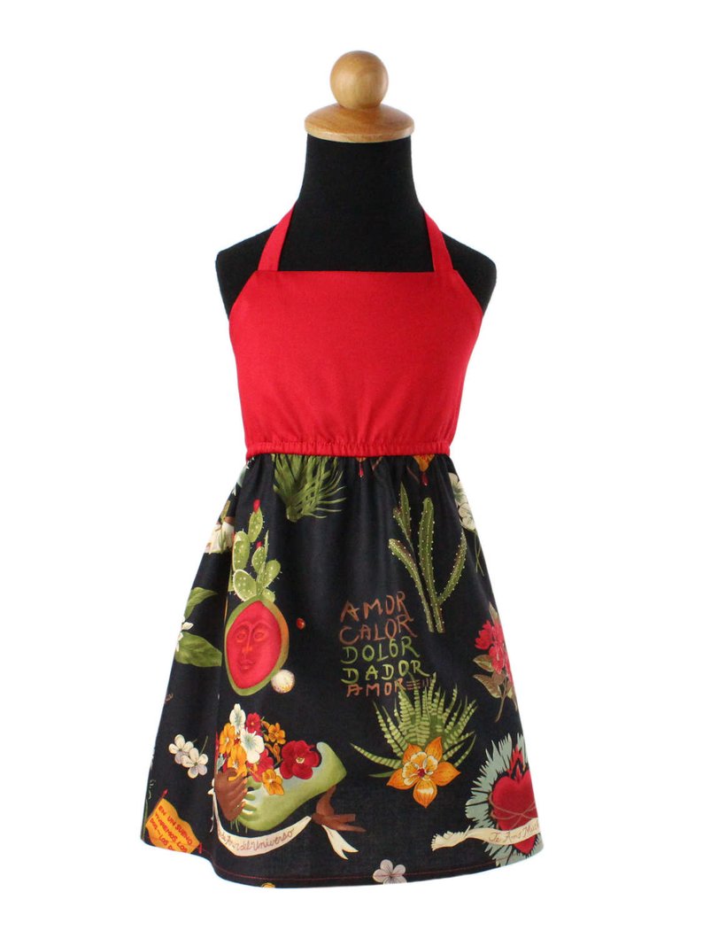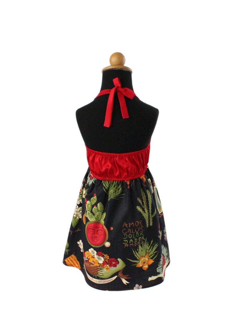 The dress comes with stretch on the waist and on the back, making it a comfortable fit for all ages and sizes. It is filled with an eclectic Frida inspired print with images of the sun and cacti. The red ribbon halter tie gives it that extra punch of color. Don't miss out on this Frida print that speaks of warmth and love.