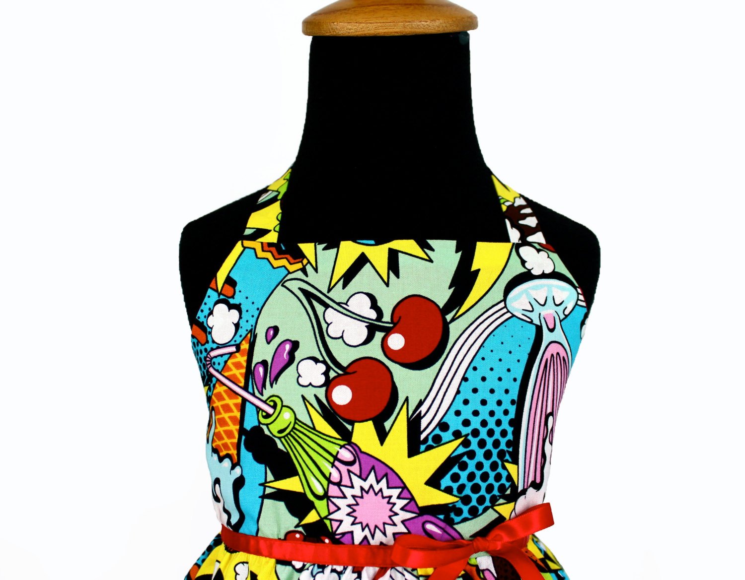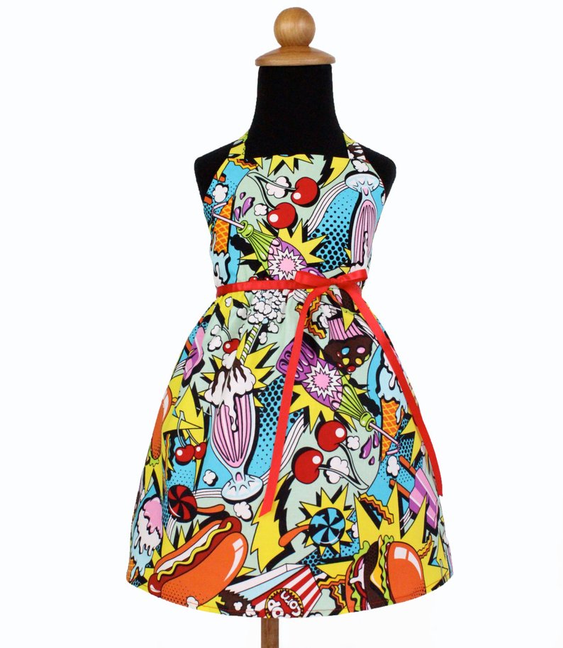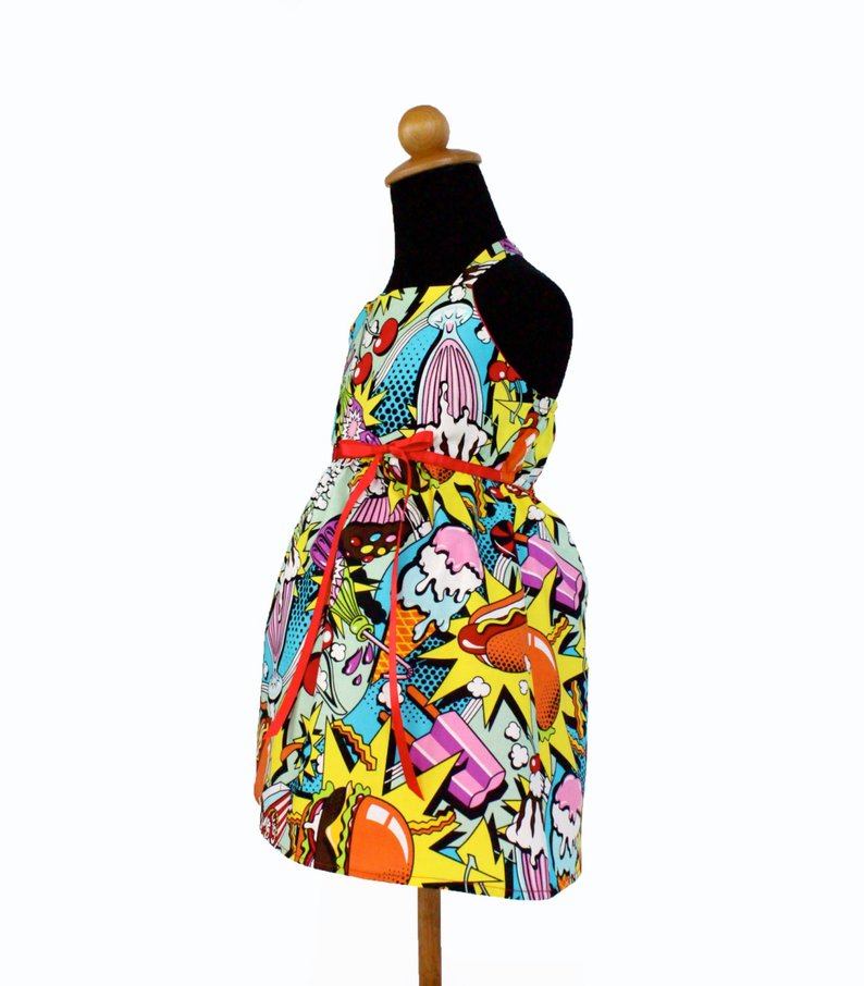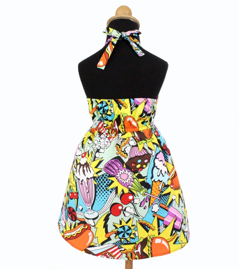 The dress comes with elastic on the waist and on the back, making it a comfortable fit for all ages and sizes. It is filled with 1950's diner food images such as ice cream sundaes, burgers,hot dogs, cherries and soda pop . The vibrant colors make it an easy dress to match with your favorite cardigan. Paired with a cute pair of flats, sandals or boots ... it's the perfect casual outfit .