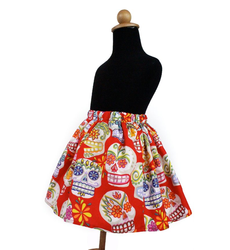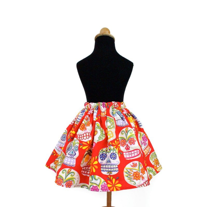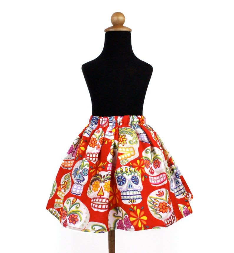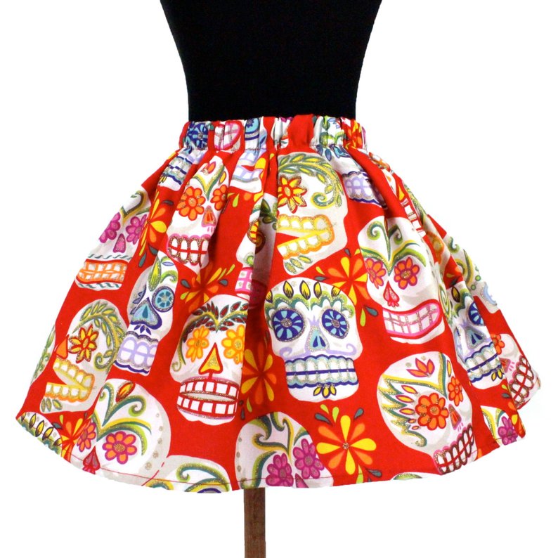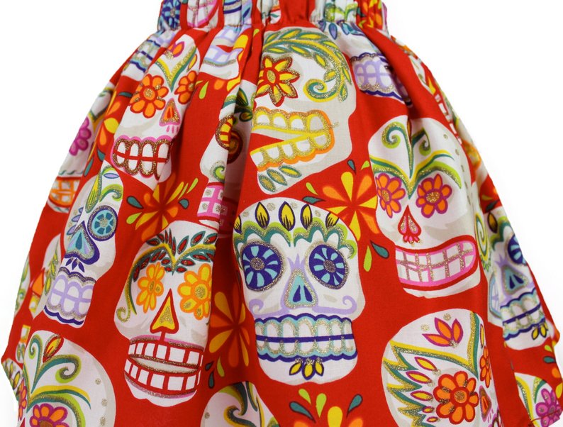 These are our new adorable pleated skirts. Perfect for your little girl. Can be worn with sandals in the warm months or pair them with some leggings and boots for an adorable winter look. This is an eclectic print composed of glittery sugar skulls