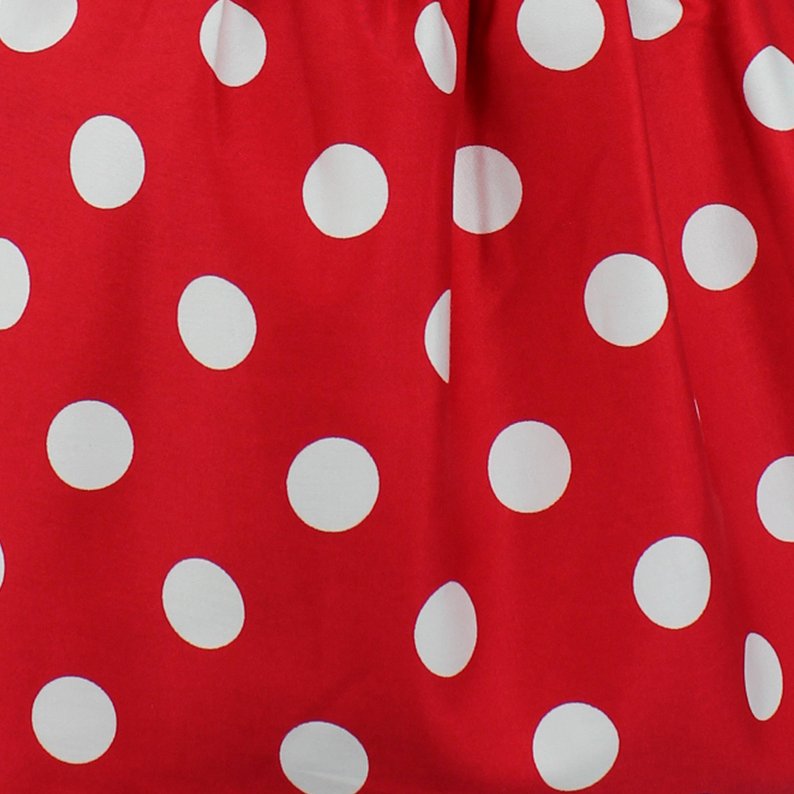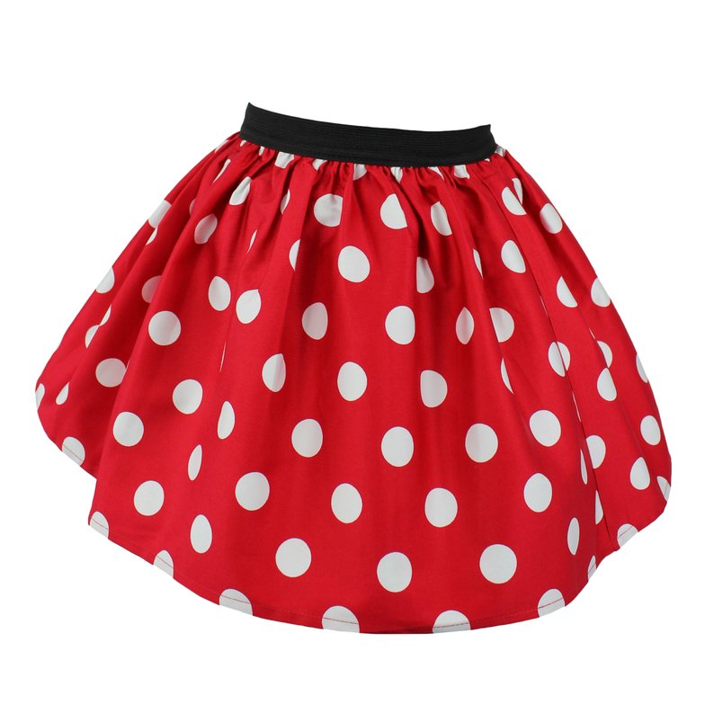 The Minnie Mouse inspired skirt is composed white polka dots on a vibrant red. Style it with another dotted top, a solid black, solid white, or solid red. Perfect to wear on 1950's themed parties or trips to the amusement park.
