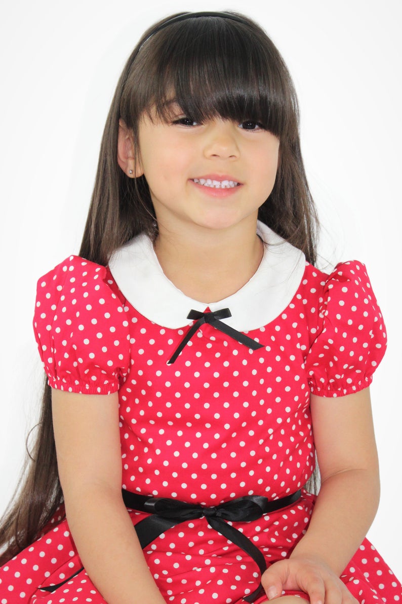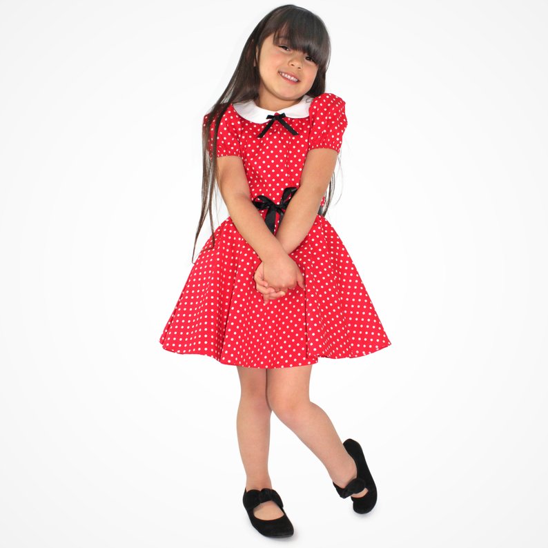 This is our new adorable girls dress! Perfect for a little princess. The collar and sleeves on this vibrant red dress provide the classic vintage inspired look. It can be worn with some leggings and boots for an adorable winter look or velvety shoes. One things for sure, your little lady will be ready for all of dapper inspired gatherings with this fashionable dress!