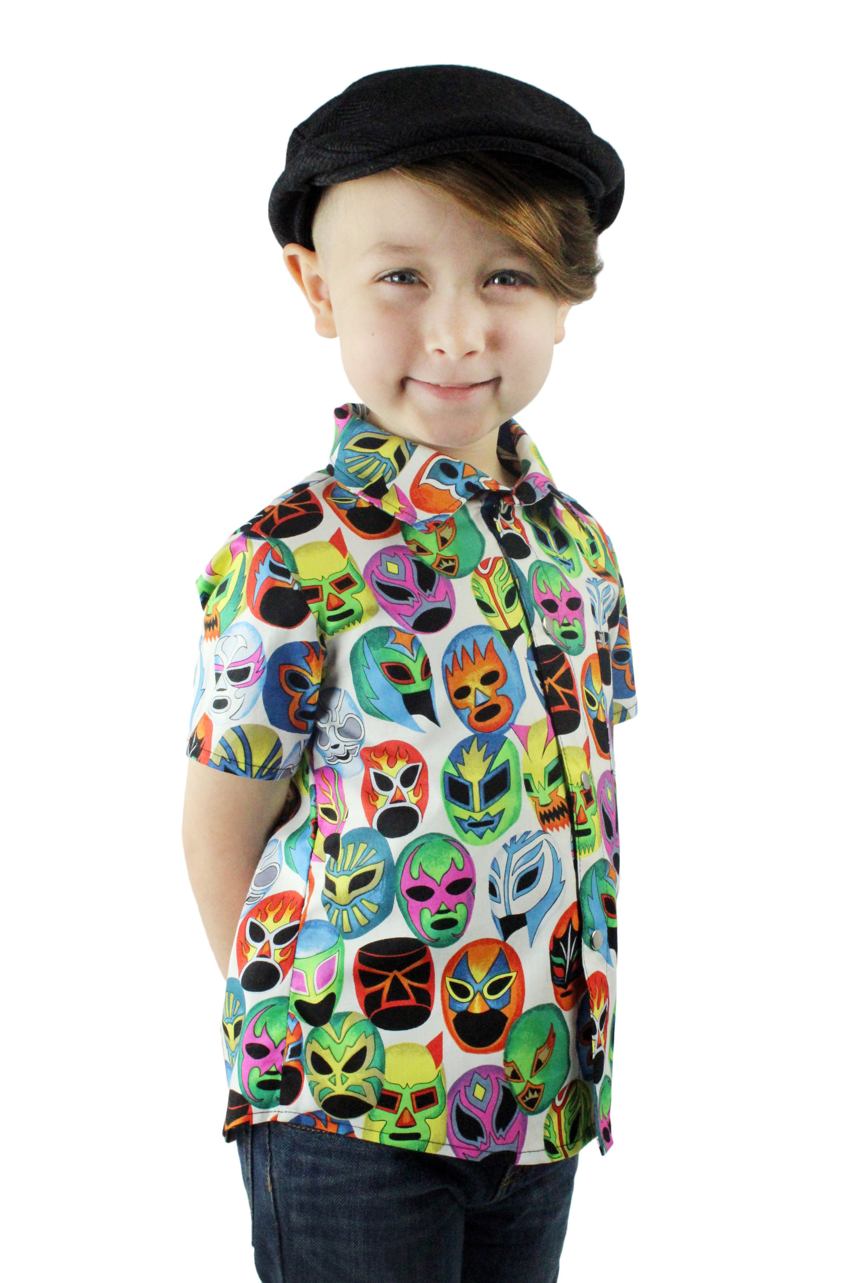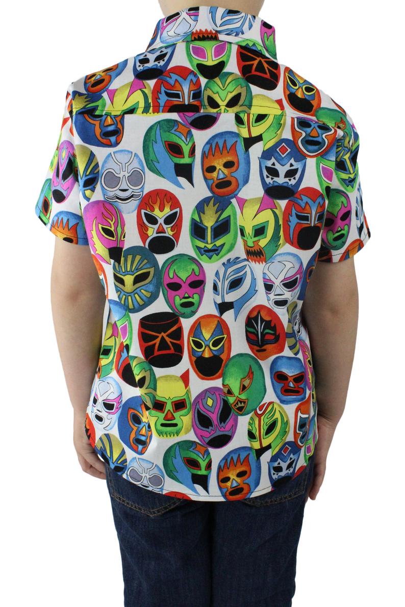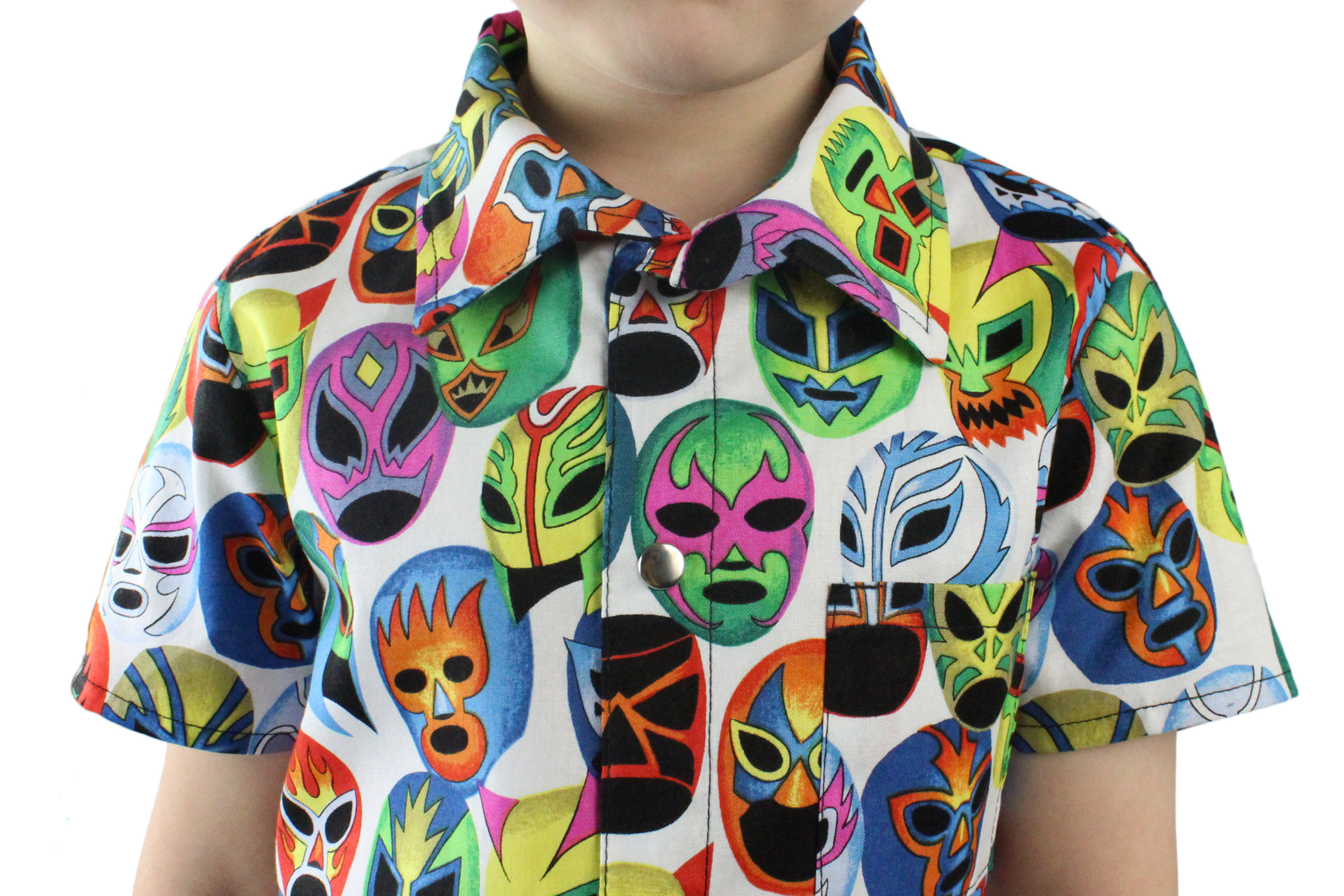 Enjoy this one of a kind snap top with the many faces of many Lucha Libre wrestlers. Colorful, fun, and light for the Summer.