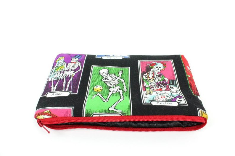 The colorful Skeletons Wallet with black satin cushion lining is a perfect size to throw in your purse! It's big enough to keep cards, make-up, coins and small miscellaneous items. You'll have peace of mind knowing your glasses, pocket mirrors, and delicates had cushion to bounce on after day to day beating to your purse.