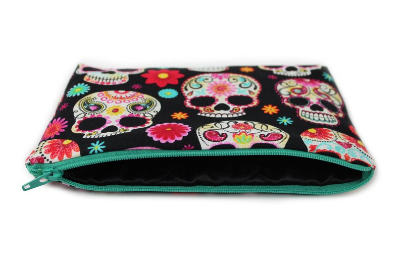 The colorful Sugar Skulls Wallet with black satin and cushion lining is a perfect size to throw in your purse! It's big enough to keep cards, make-up, coins and small miscellaneous items. You'll have peace of mind knowing your glasses, pocket mirrors, and delicates have cushion after day to day beating to your purse.
