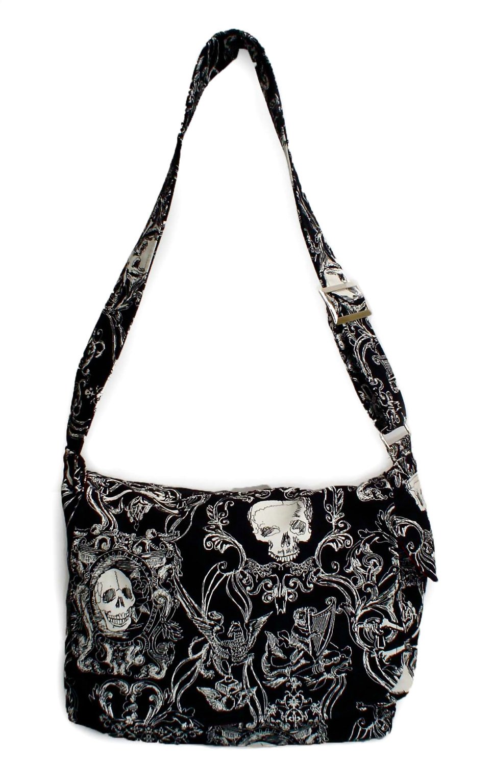 Our newest bag features a great Victorian Gothic Print. The Print on the bag is composed of Skulls and Crossbones. The fabric is is a Heavy Cotton Oxford Canvas Material so it is extremely durable . This bag has is very versatile ! It can be used as a book bag, 13" Macbook Bag, for the office, as a Diaper Bag or as a purse. Perfect for men or women. It is a fun piece that will be admired by everyone. Interlined with a thick red poly-satin blend. The craftsmanship in this item is neat and of great quality.