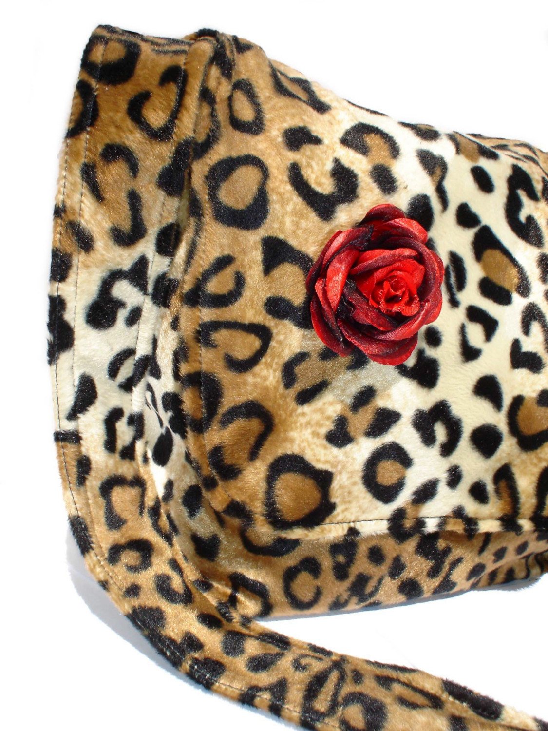 This is a really cute bag! The bag is made from a Rich Leopard Faux fur exterior and comes with a luscious red rose attached. The Black full Satin interior lining goes perfectly with this print.