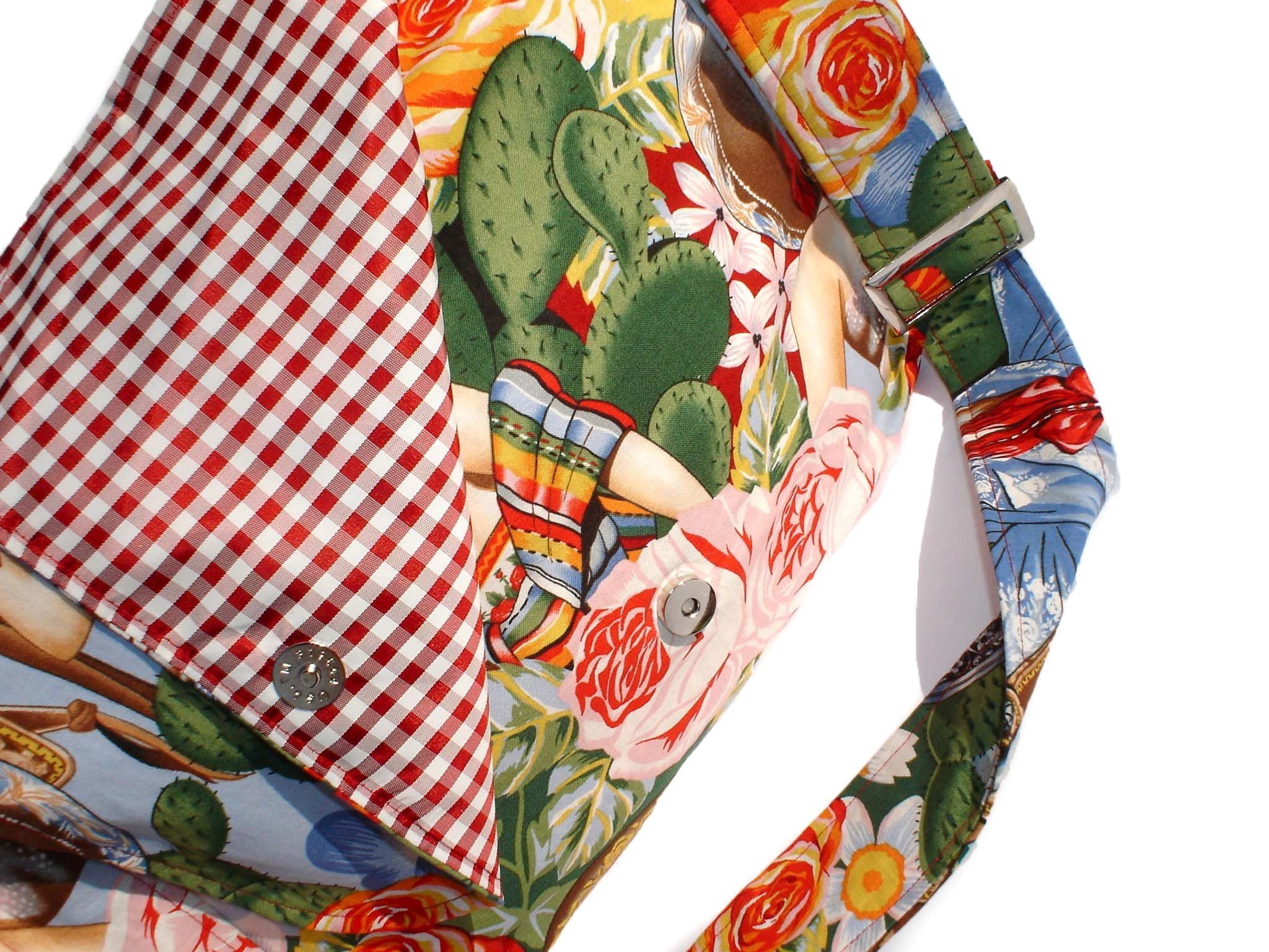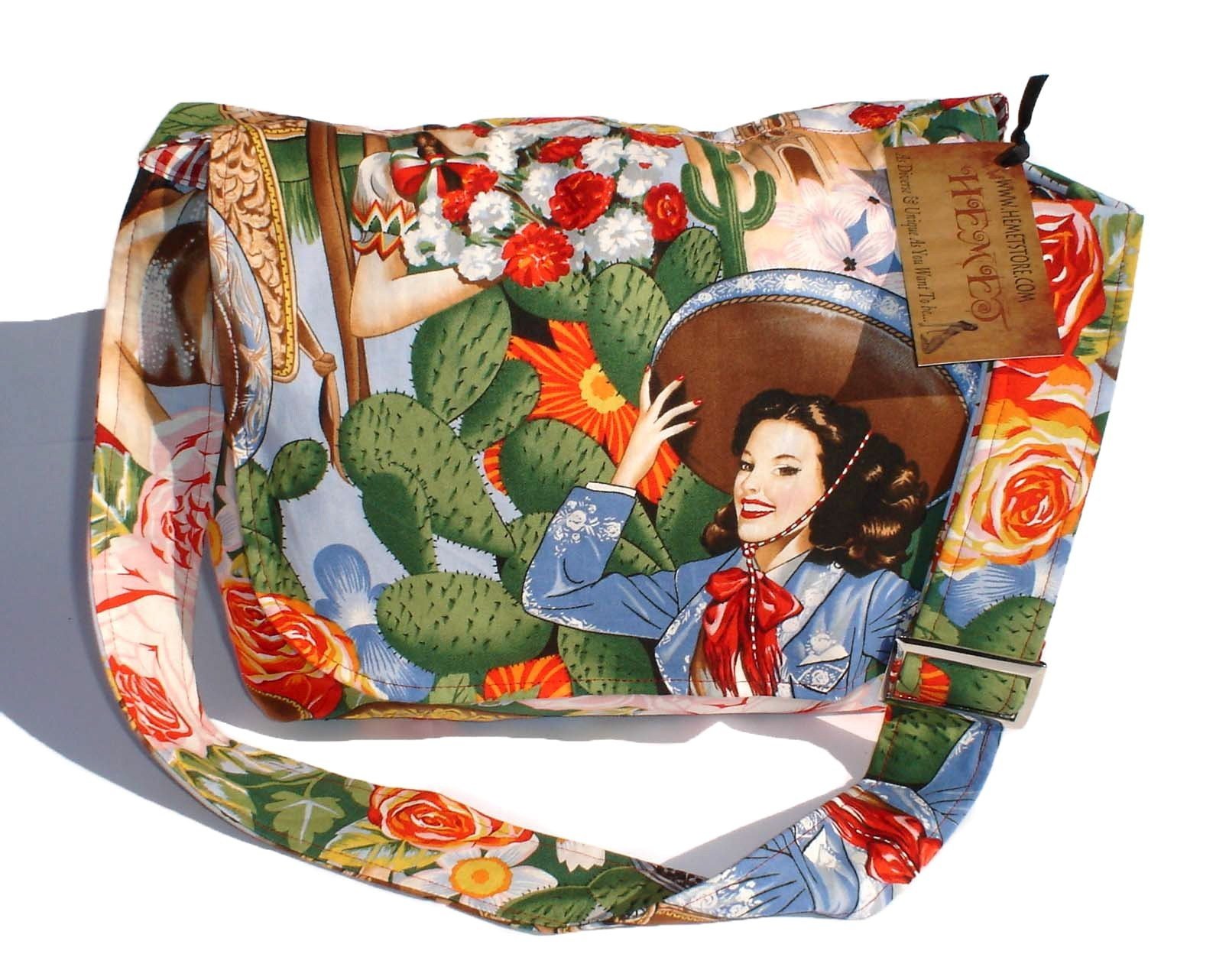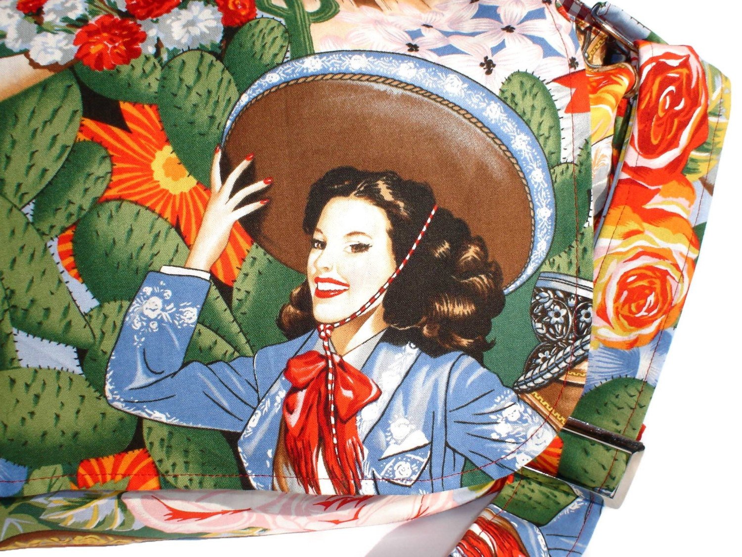 Mexican Pinup Girls in various Mexican attire such as Mariachi outfits , cacti, flowers, and missions cover this magnificent bag.