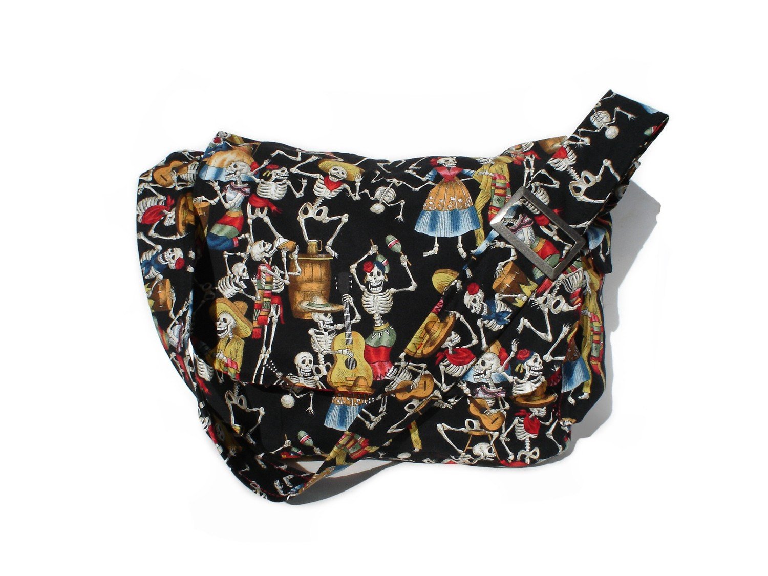 Festive Day of the Dead messenger bag with adjustable straps for a comfortable fit for varying sizes. Interlined with a thick red poly-satin blend. This fabric features colorful day of dead lovers. The craftsmanship in this item is neat and of great quality.