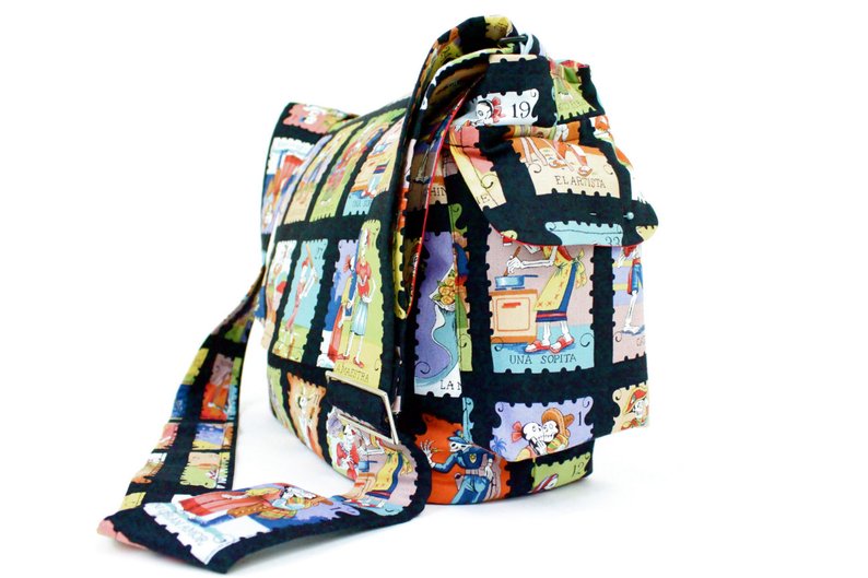 This amazing print comes alive with different eclectic Characters......Chefs, Dancers, Soccer players, baseball players, boxers, cowboys, Teachers, Artists and more . Each card is detailed and unique. One of my favorite fabrics.The images are colorful and original. Interlined with a red black poly-satin blend. The strap is fully adjustable and can be worn across the body. It is perfect for Men or Women and can be used as a 13' Macbook bag, Laptop bag, Book Bag, Office Bag, even makes a fun Diaper Bag.