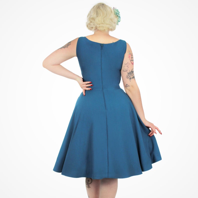 Step into the 1950s with this adorable teal dress appropriate to wear to casual and formal events. The material flowy and light—comfortable to wear any Spring and Summer. Pockets in the circle skirt make strolling through the streets look effortless and accommodate small accessories like jewelry and lipstick. Twirl in this beautiful dress with or without a petticoat. The outfit combinations are endless!