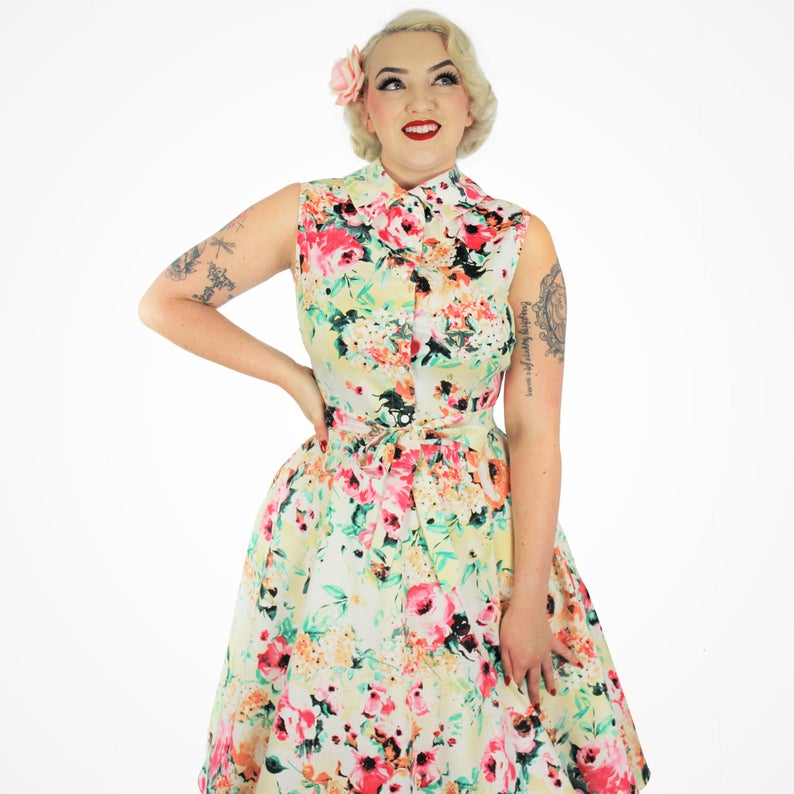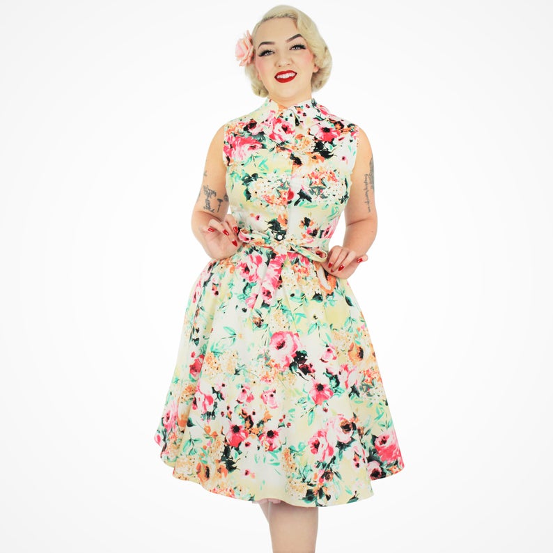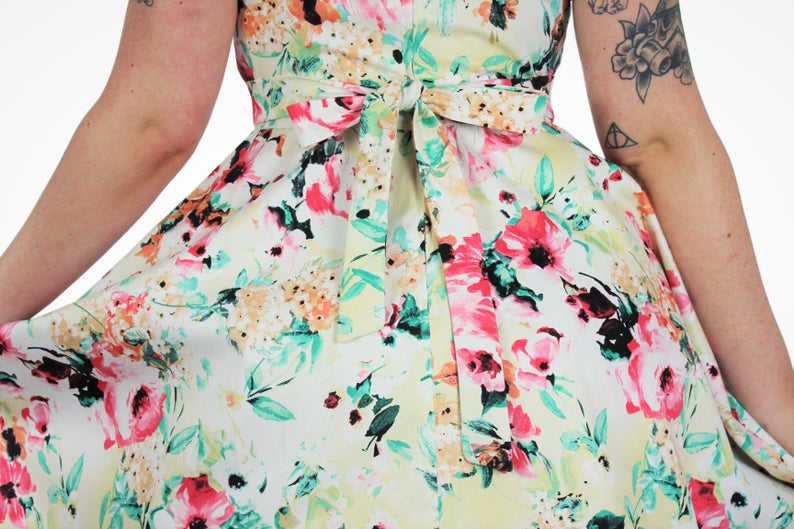 Fall in love with this adorable floral dress featuring shoulder appeal, a front snap up closure, back zipper closure, two side pockets, collar, and attached belt that can be tied either at the front or back. The material is sturdy yet comfortable to wear any Spring and Summer as it is sleeveless. Pockets in the circle skirt make strolling through the streets look effortless and accommodate small accessories like jewelry and lipstick. Twirl in this beautiful dress with or without a petticoat.