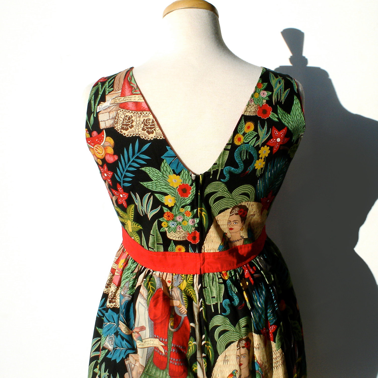 Frida comes alive in this fresh novelty fabric. Frida is in a tropical forest setting surrounded by her monkey and parrot companions. The back has a wonderful V-shape attributing to the overall very feminine look of this dress. A full back 14" zipper enables easy dressing.
