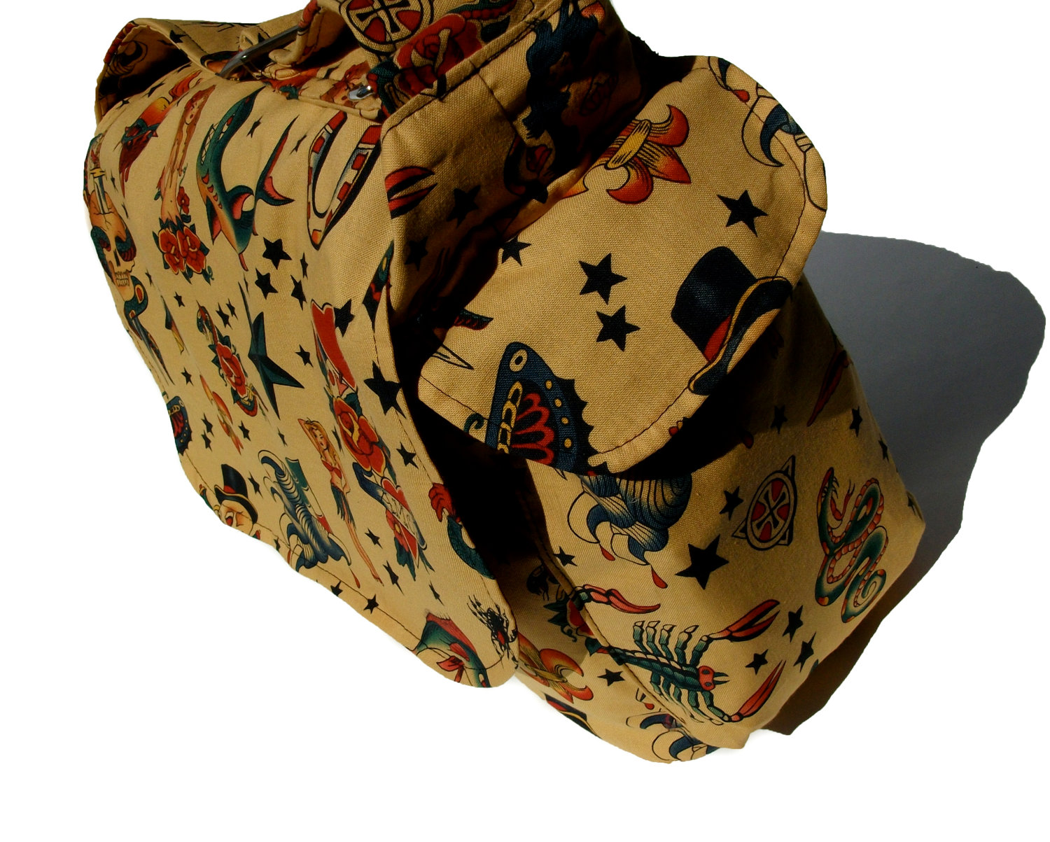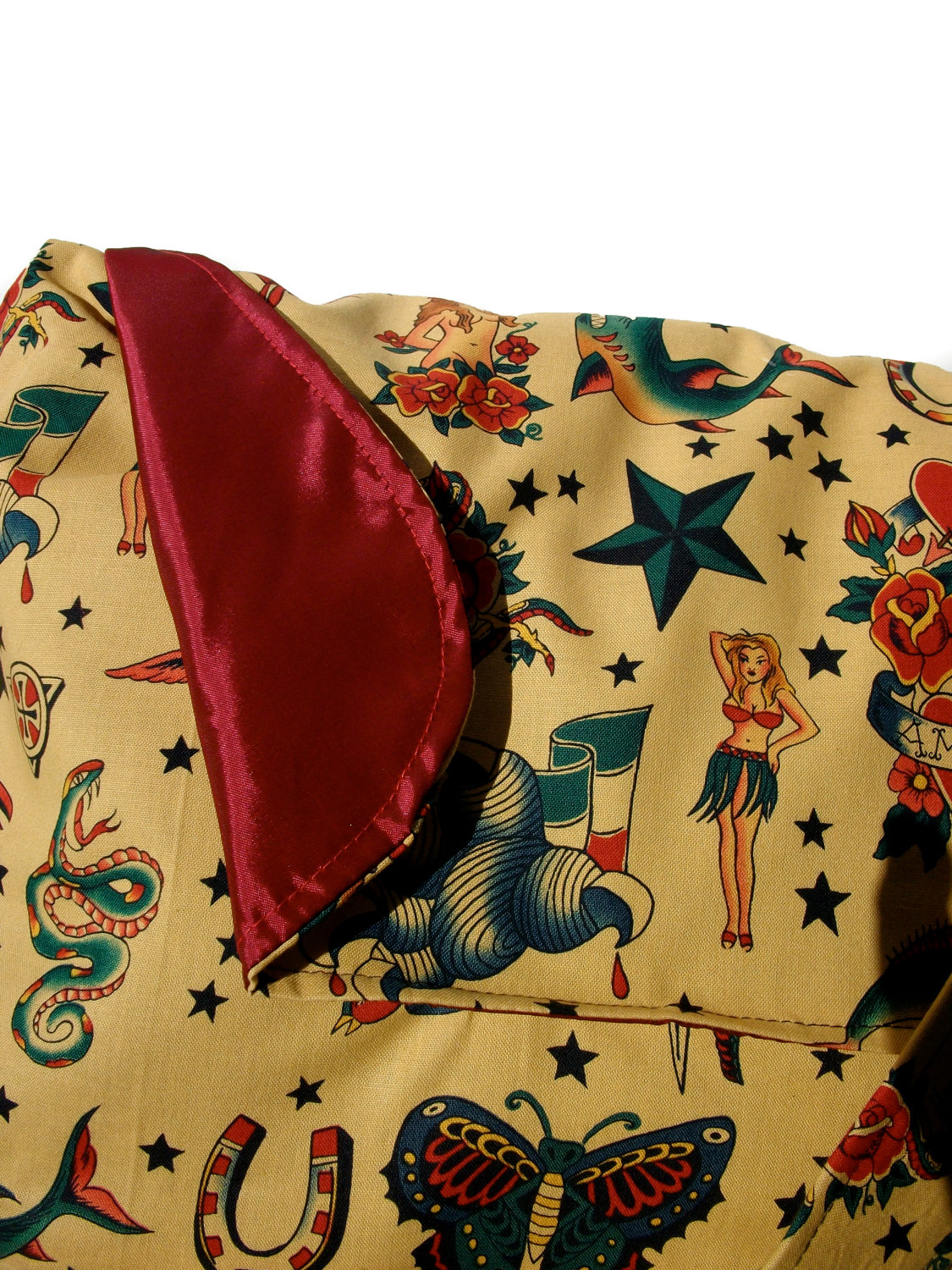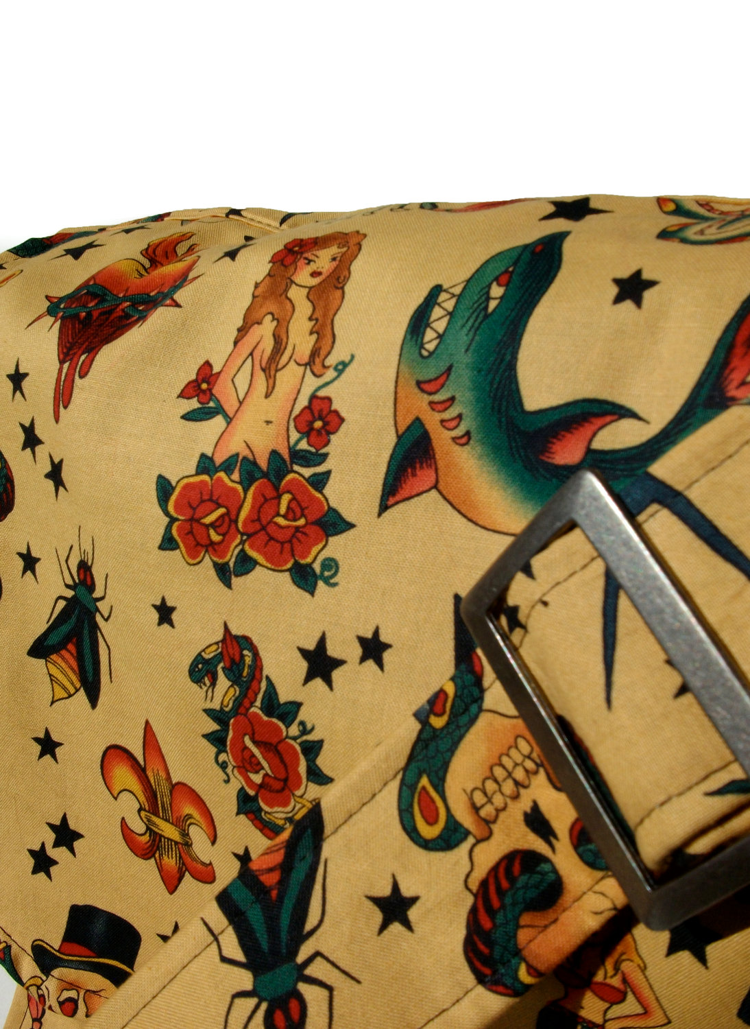 This Awesome Messenger Bag features a print composed of vintage Tattoo art. The images are detailed and retro inspired. The Strap is adjustable and can be worn across the body. The bag is Interlined with a thick rich red poly-satin blend.