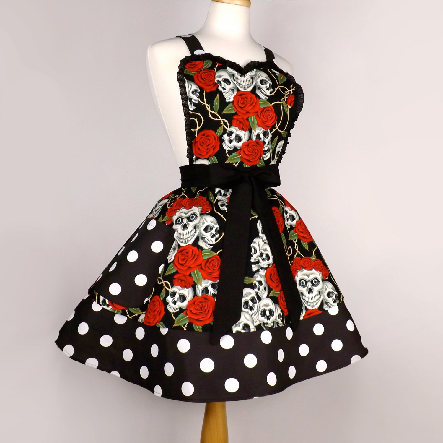 This two-tier apron is so very cute. Composed of a very fun Skulls and Roses fabric, this apron has it all! Two tiers make this a very darling piece. The bottom layer has a black and white polka dotted fabric. The belt is in a black color which makes this apron fully come to life. The chest is accentuated with a black eyelet trim making it very feminine.