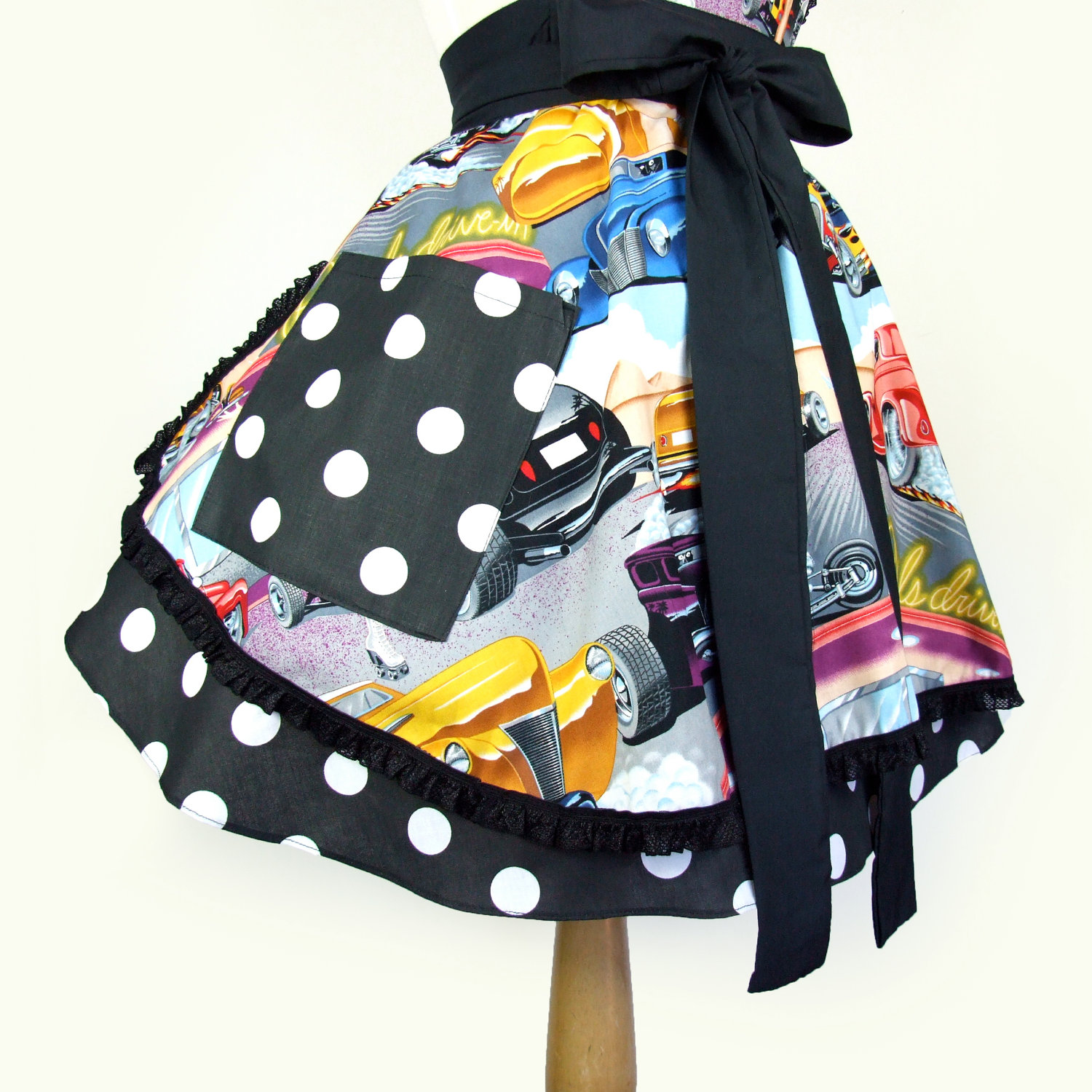 This is a classic Retro Inspired Apron featuring a collage of 50's retro diner waitresses on roller skates. An assortment of 50's hot rods ready to race and girls in poodle skirts make this a lively apron . This is a really fun classic print . This is perfect for those who reminisce about the good old days with waitresses on skates. These skatetresses are a classic 50's retro pinup style! This apron is a 2 tier/ 2 layers apron so it looks like you are wearing a dress under! So Cute !!!
