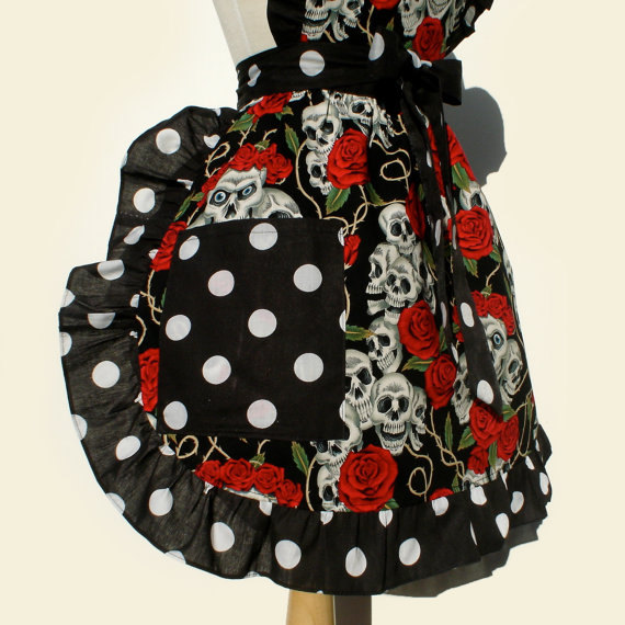 This is a fun novelty apron with skull and roses surrounded by polka dots!